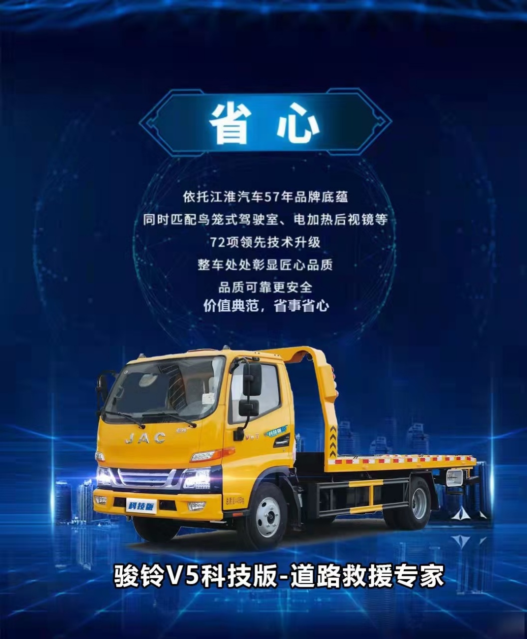 底盤配置:江淮高端駿鈴V5駕駛室,單排1900mm寬體3人座,3365mm軸距,發動機可選全柴132馬力與安徽康明斯130馬力。星銳五擋變速箱,斷氣剎,7.00R16鋼絲輪胎,ABS,液壓方向助力,氣推離合助力,定速巡航,OBD接口,框架式后視鏡,LED日間行車燈,多功能方向盤,收音機,后視鏡加熱,可調節方向盤,大燈調節,天窗通風口,多功能鷹眼儀表,發動機燃油預熱,多功能儀表,原廠空調,自動調整臂,PTO功能。
